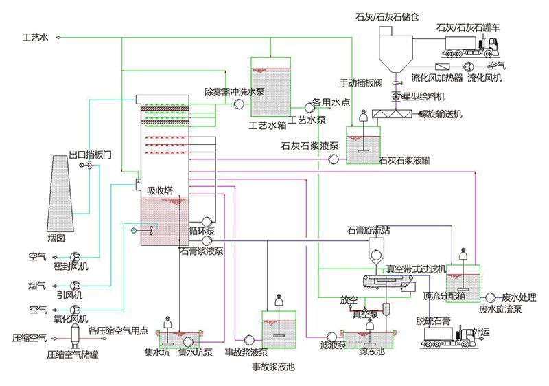 以廉价易得的石灰石或石灰作为脱硫剂,脱硫效率可达98%以上,副产的脱硫石膏可作为建材行业(如水泥厂、石膏板厂)的助剂或原料,也可作为土壤改良剂等。是技术成熟、运行可靠、应用最为广泛的脱硫工艺,广泛应用于各种规模的工业锅炉和火电锅炉。